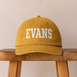 Puedes personlizarla con el nombre atrás, Cool Caps Evans para toda la familia. Los nombres serán bordados en hilo blanco, en arco, con letra estándar (font: Avenir)